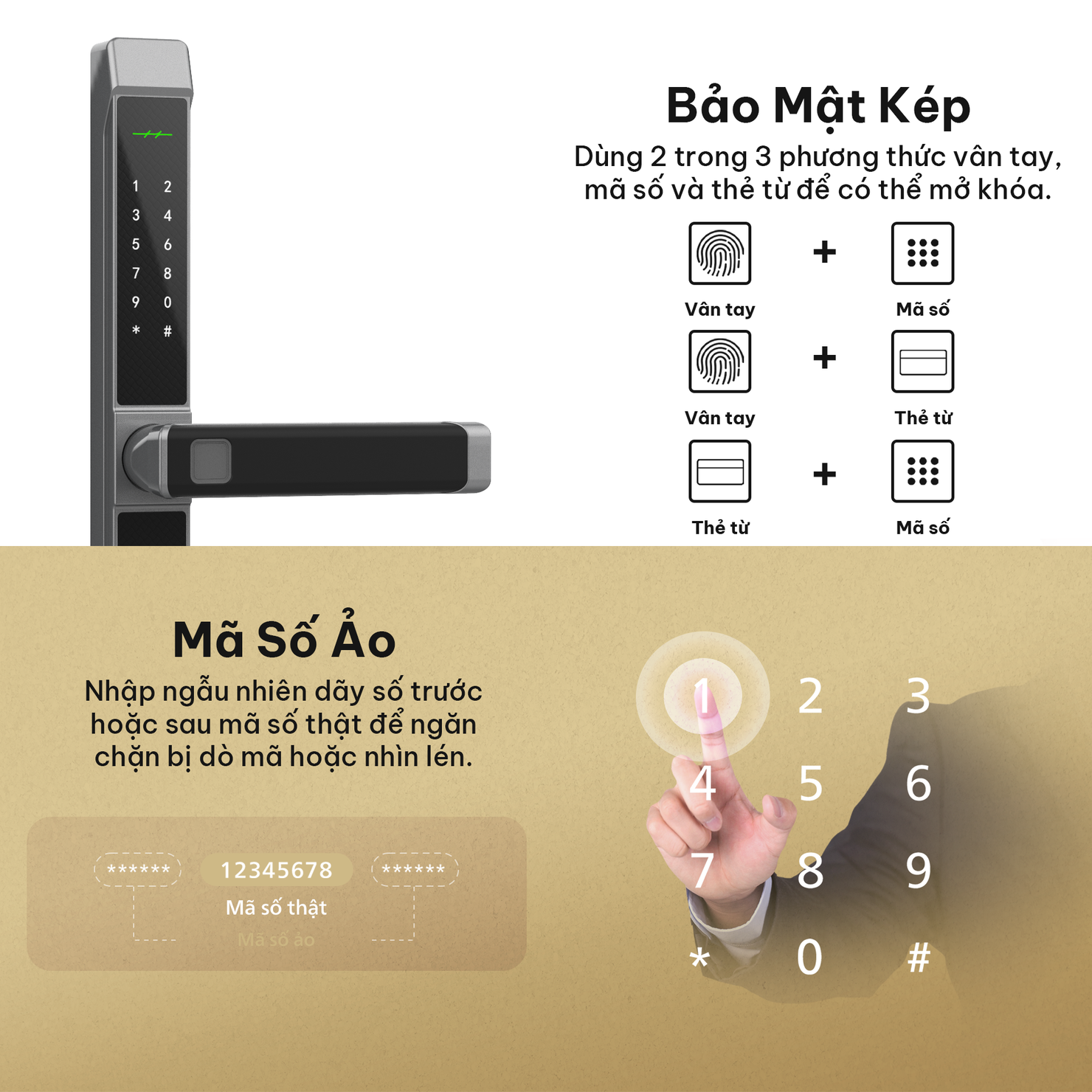 Ngoài ra, tính năng mã số ảo giúp ngăn chặn việc bị nhìn trộm mã khi mở cửa. Bạn có thể nhập thêm một dãy số ngẫu nhiên trước hoặc sau mã số thật mà vẫn mở khóa bình thường, khiến người đứng gần không thể đoán ra mã chính xác. Đây là một lớp bảo vệ thông minh, giúp bạn an tâm hơn trong môi trường đông người hoặc có gắn camera giám sát.