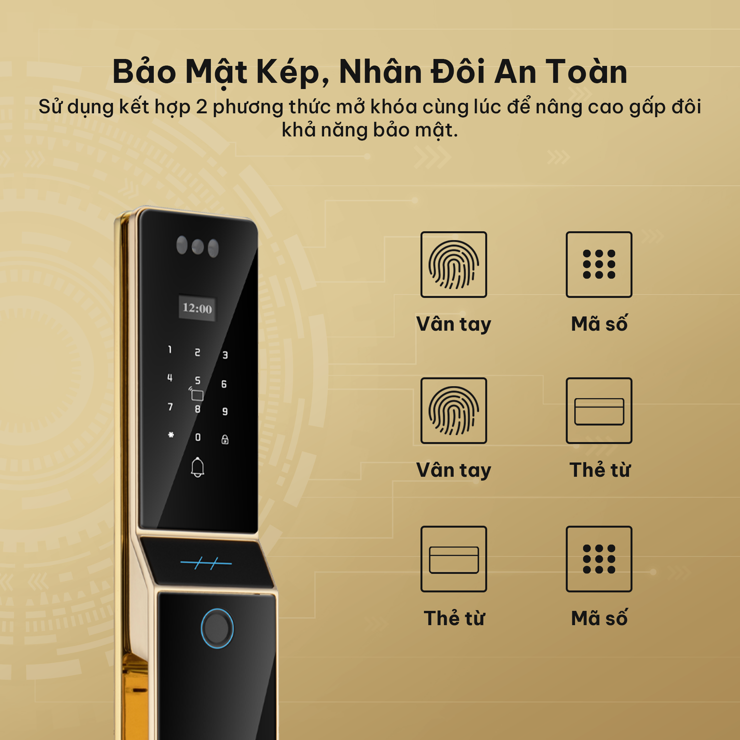Xác thực kép: Kết hợp hai phương thức mở khóa cùng lúc giúp tăng cường bảo vệ cho những không gian cần độ an ninh cao như phòng làm việc riêng, tủ tài liệu hoặc căn hộ cao cấp.