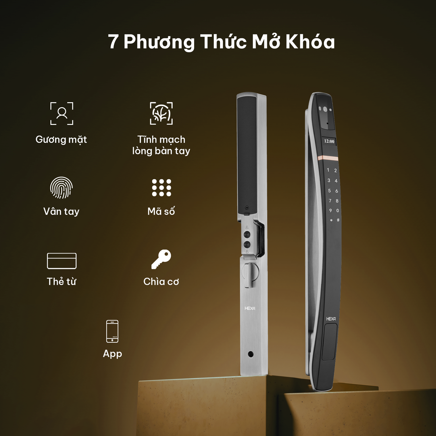 Phương thức mở cửa: App Hexa mở khóa từ xa, Gương mặt, Tĩnh mạch lòng bàn tay, Vân tay, Mã số, Thẻ từ, Chìa cơ.